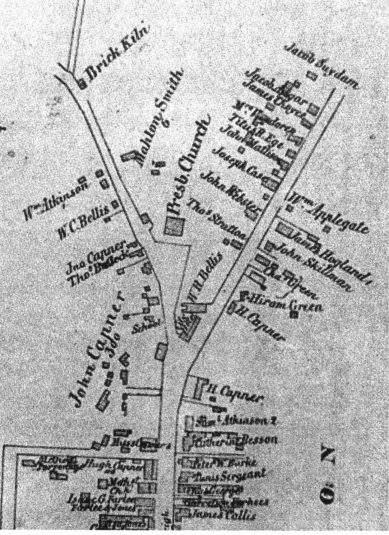 By plotting the deed for the half-acre lot along with all the bordering properties named in the deed from Martha Wilson & Geo. C. Maxwell to Elnathan Moore, as well as later deeds for the half-acre lot, I was able to determine that the Stewart lot was eventually owned by Charles Green, who’s property appears on the 1850 map titled “Plan of the Township of Raritan” (below); also on the Cornell Map of 1851.