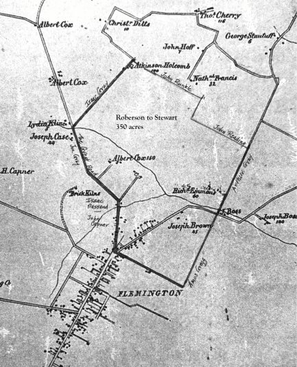 Here is an outline of the property overlaid on the 1850 map of Raritan Township, showing how the Robeson-Stewart tract covered most of Flemington from the Civil War monument north.